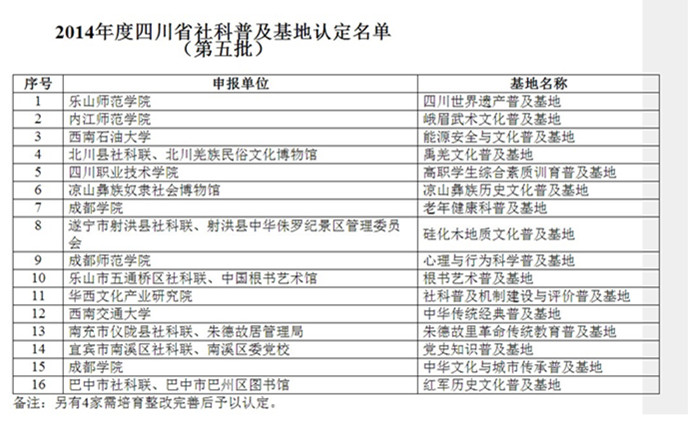 2014年度,省级社科普及基地评定工作从今年3月正式启动,于近期结束。我校中华传统经典普及基地获评为我省第五批 “四川省社会科学普及基地”。