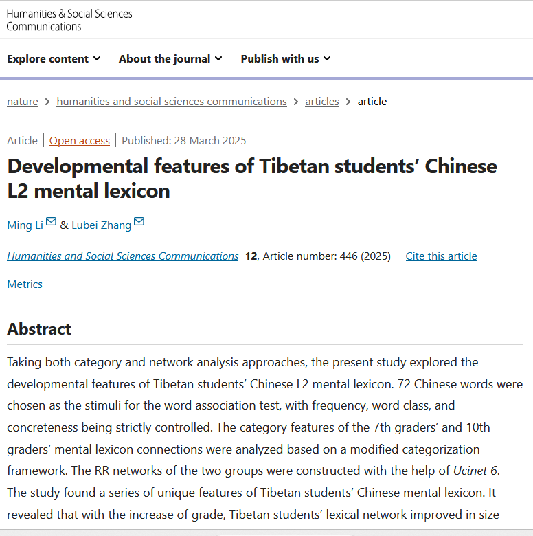 NATURE(《自然》)子刊Humanities and Social Sciences Communications(《人文社会科学通讯》)于2025年3月28日刊发了研究论文“Developmental features of Tibetan students’ Chinese L2 mental lexicon”(https://doi.org/10.1057/s41599-025-04723-0),外国语学院黎明教授为第一作者,张露蓓教授为通讯作者。