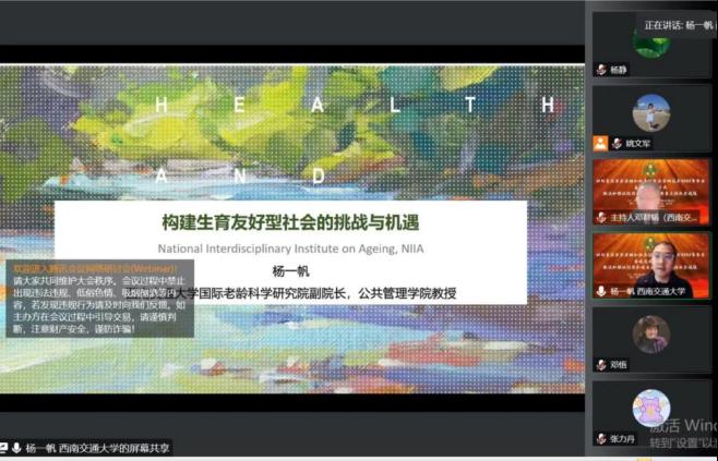省劳动和社会保障法学研究会常务副会长兼秘书长、公共管理学院教师邓君韬副教授主持会议;公共管理学院教师、国际老龄科学研究院副院长、杨一帆教授受邀参会并发表《构建生育友好型社会的机遇与挑战》主题演讲,从社会学视角通过对人口生育现状的剖析提出疫情之下如何更好构建生育友好型社会的相关政策建议。