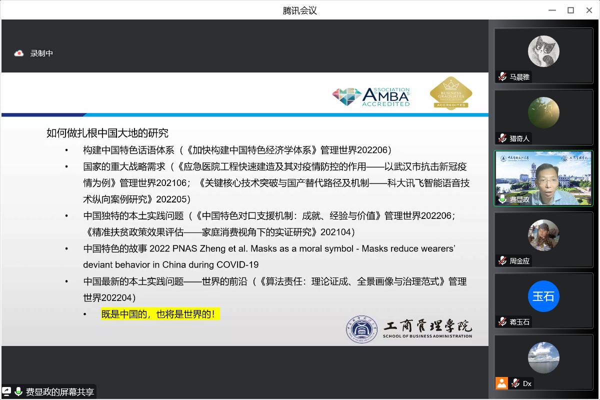 讲座分享中,费显政教授首先通过“把工商管理研究做在祖国的大地上”这一学术追求和使命情怀,引出“如何做扎根中国大地的研究”的主题,并尝试提供“构建中国特色话语体系”、“国家的重大战略需求”、“中国独特的本土实践问题”、“中国特色的故事”、“中国最新的本土实践问题——世界的前沿”等五种研究途径和视角。