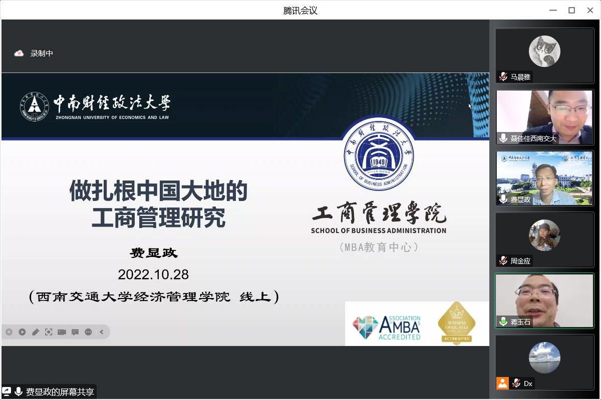 2022年10月28日19:00,中南财经政法大学工商管理学院副院长费显政教授应邀为经济管理学院师生带来题为“做扎根中国大地的工商管理研究”的线上讲座。本次学术活动由市场学系蒋玉石教授主持,校内外师生80余人参加了本次讲座。