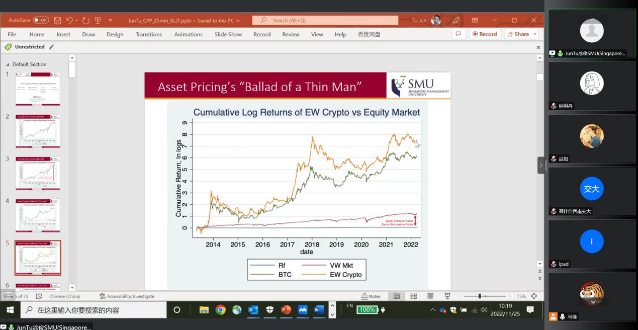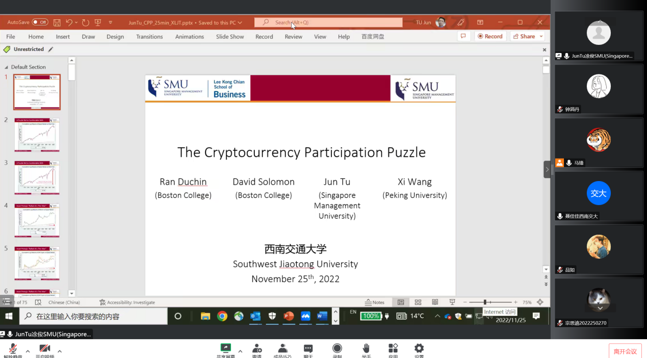 11月25日上午10点,应经济管理学院邀请新加坡管理大学凃俊副教授为经济管理学院师生以“The Cryptocurrency Participation Puzzle”为主题作线上学术讲座。讲座由经济管理学院副院长聂佳佳教授主持,学院教师及研究生积极参与了本次讲座。